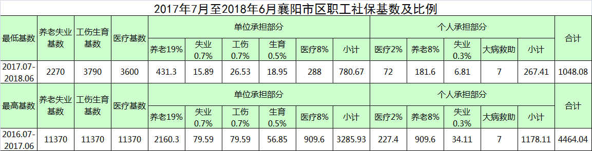 :1、個(gè)人基數(shù)以員工本人上年月均工資為基礎(chǔ),十舍五入保留至十元位,但不得高于2015年度襄陽市社平月工資3560元的300%,養(yǎng)老保險(xiǎn)和失業(yè)保險(xiǎn)基數(shù)不得低于社平工資的60%,工傷保險(xiǎn)和失業(yè)保險(xiǎn)基數(shù)按社平工資3790計(jì)算,醫(yī)療險(xiǎn)基數(shù)按社平工資的95%。